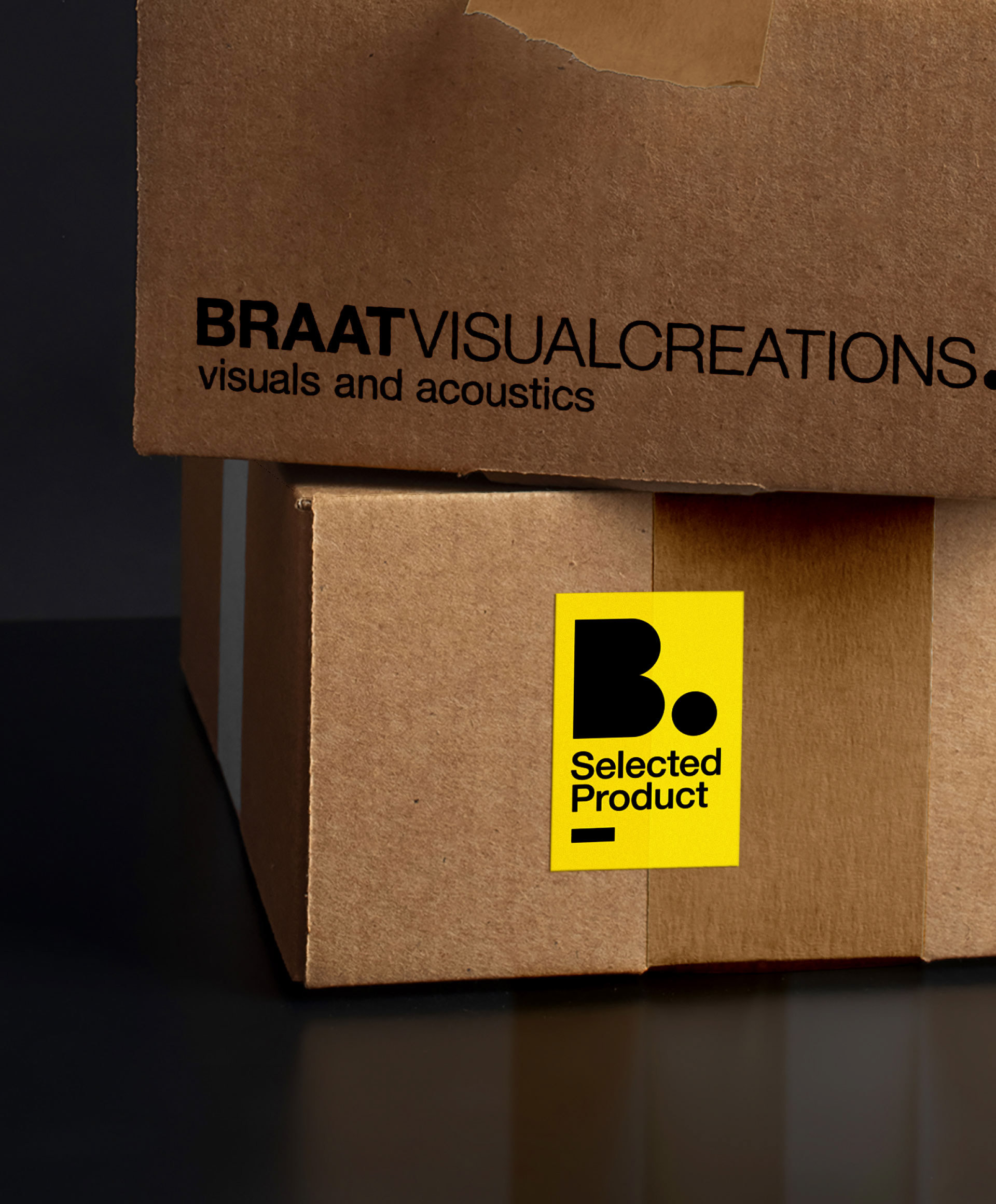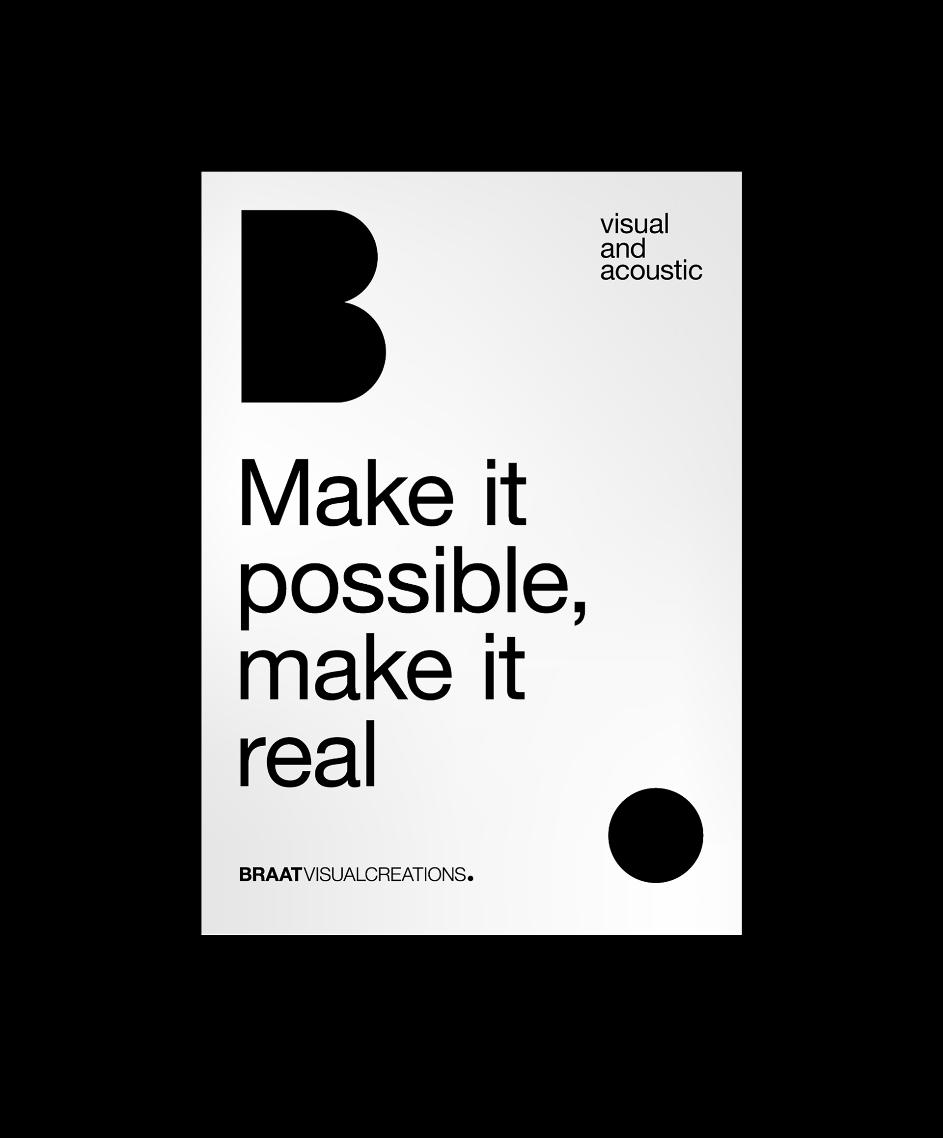The symbol’s sleek, modern style visualises the powerful tone of Braat Visual Creations. With its flexibility of being deconstructed, it adapts to diverse layouts, integrates seamlessly with images and slogans, and can also be used narratively to tell the story of the company and its products.